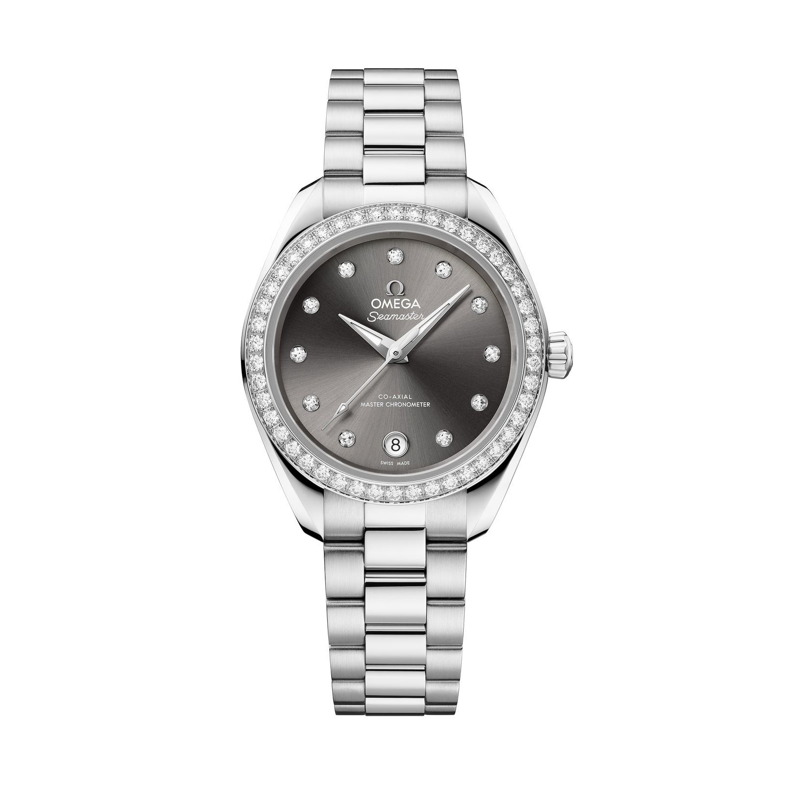 Seamaster Aqua -Terra 150 M Ø 30 mm, Automatik, Co-Axial Master Chronometer, antimagnetisch bis 15.000 Gauß, Edelstahl, Lünette mit 46 Diamanten (0,81 ct.), Indizes mit 11 Diamanten (0,10 ct.) besetzt, wasserdicht bis 15 bar. 13.800 Euro